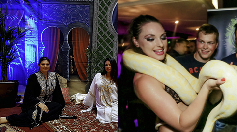 In het thema “1001 Nacht” hebben wij verder nog arrangementen met een waarzegster, een buikdansshow, schoenenpoetser, een compleet waterpijpenterras, gepaste themakleding, decoratie en zelfs 1 of 2 kamelen. Wij zijn ook beschikbaar voor een ritje op een kameel, een fotoshoot met 1 of meerdere slangen, een buikdansact en iemand die henna tattoos kan zetten.